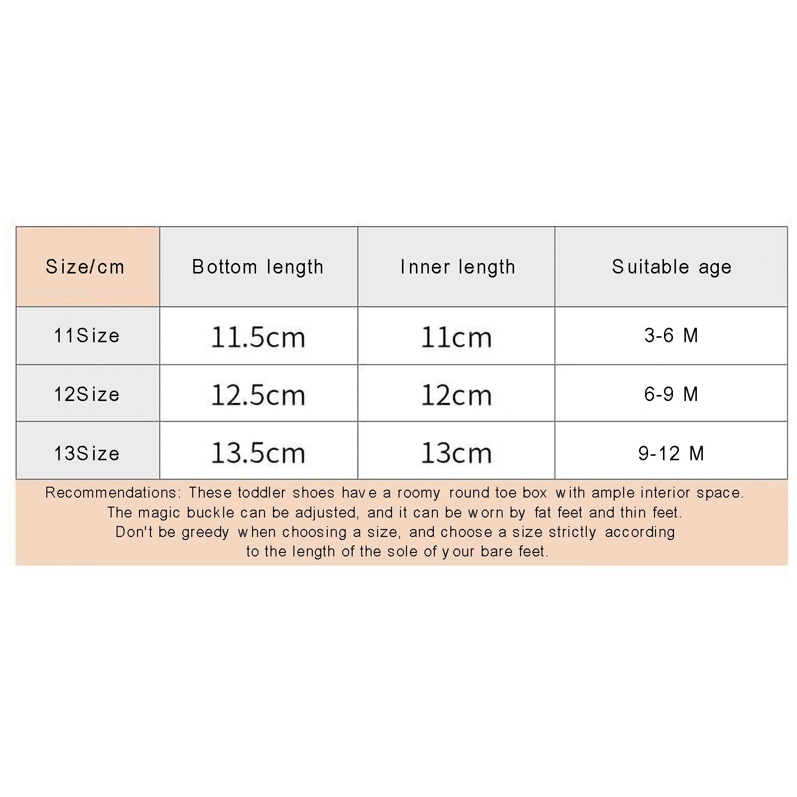 12(size label) Insole Length: 4.72 Outsole Length: 4.92 Advised Age: 6-9 Months