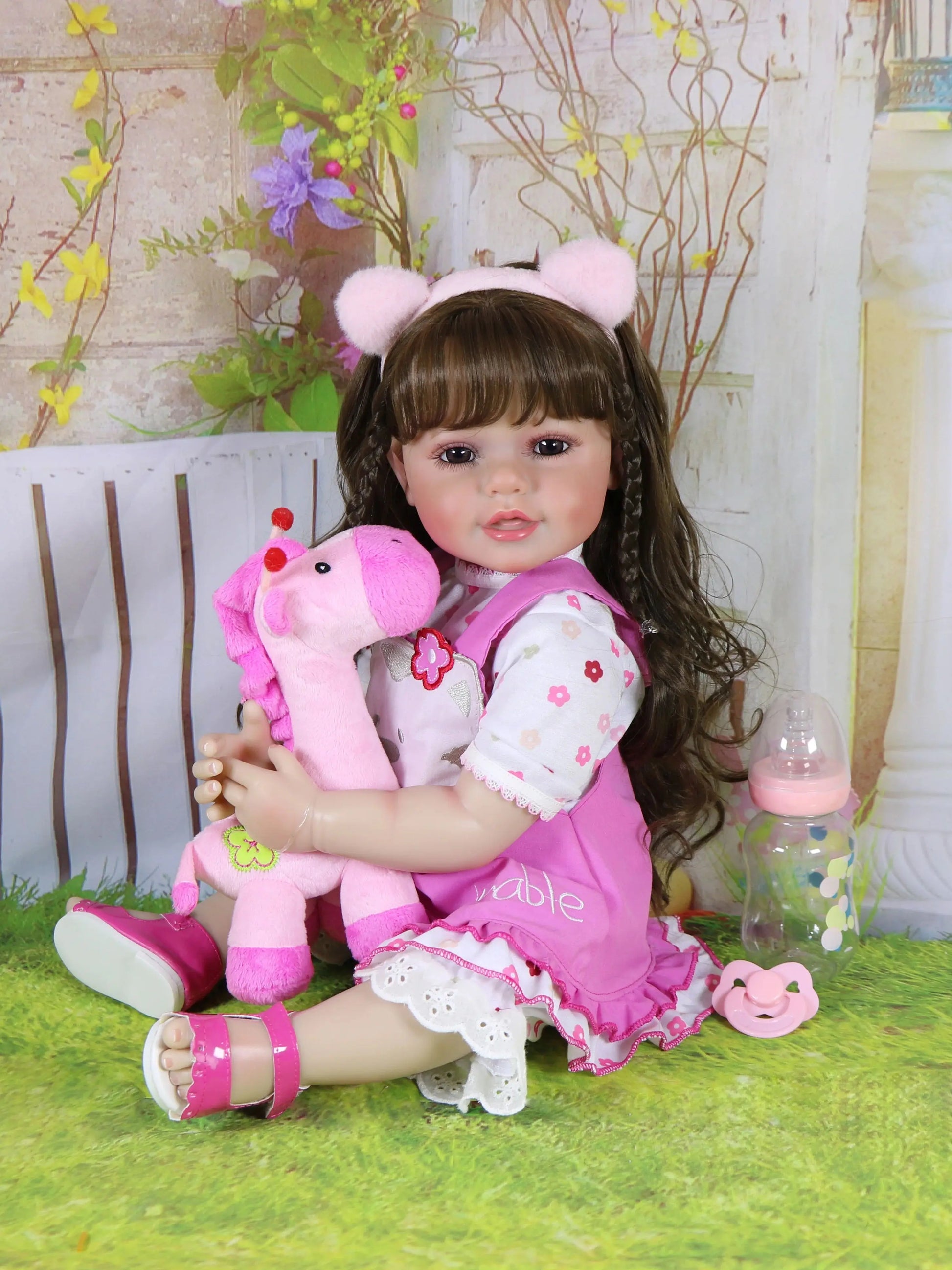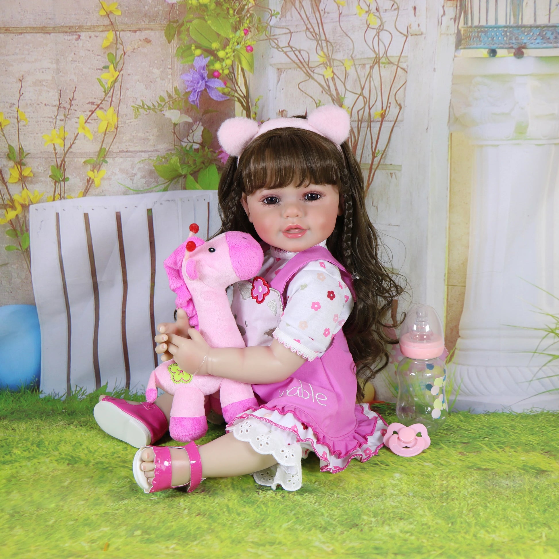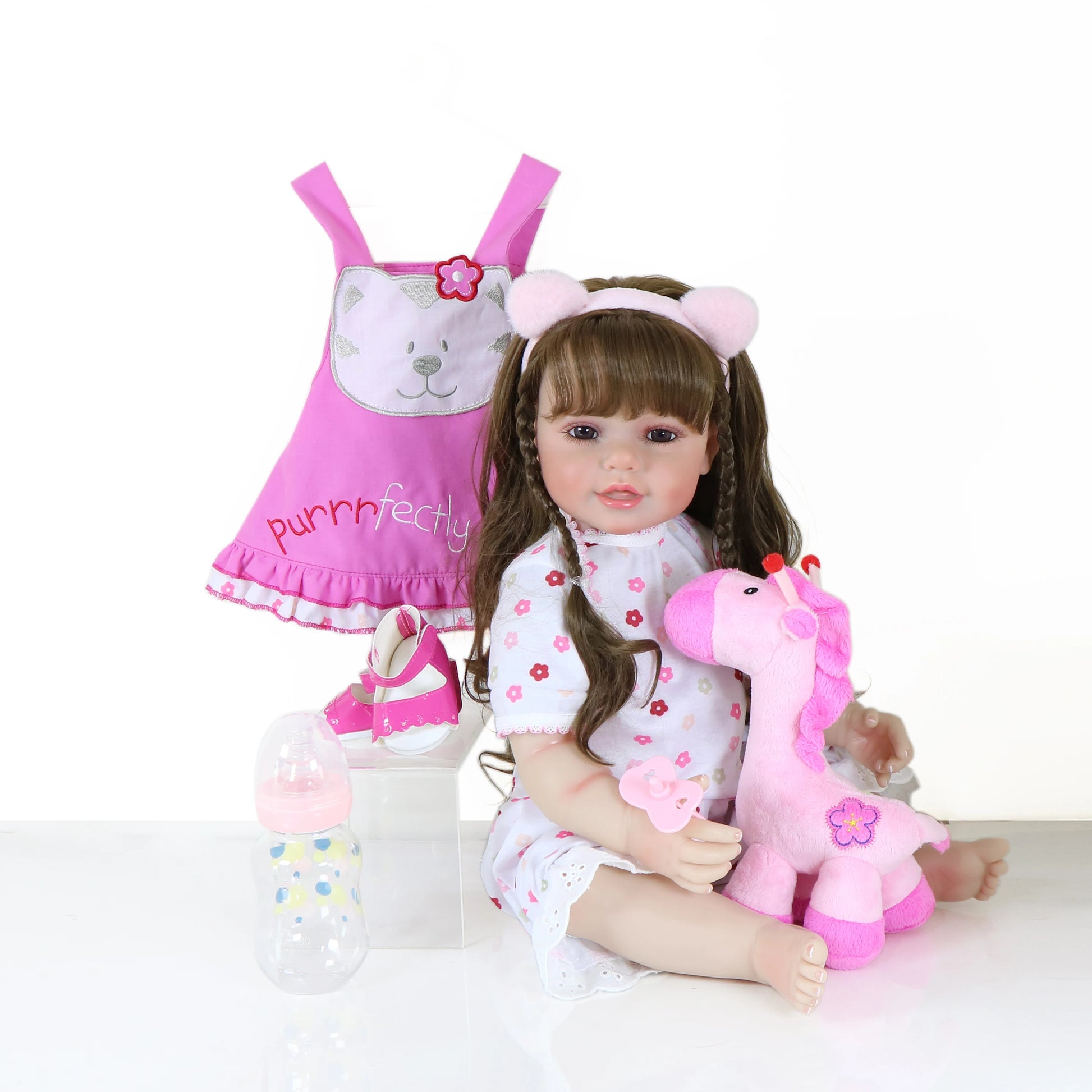 Ensemble includes – 1 One-piece outfit, 1 pink Ear headband, 1*shoes, 1.Birth Certificate 1 pacifier, 1*Stuffed Animals and 1 bottle