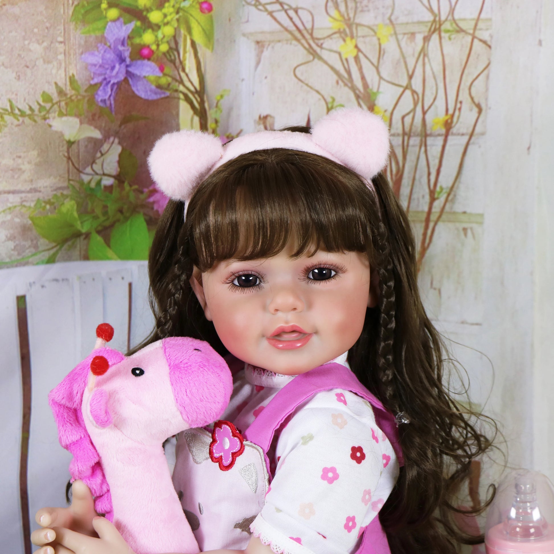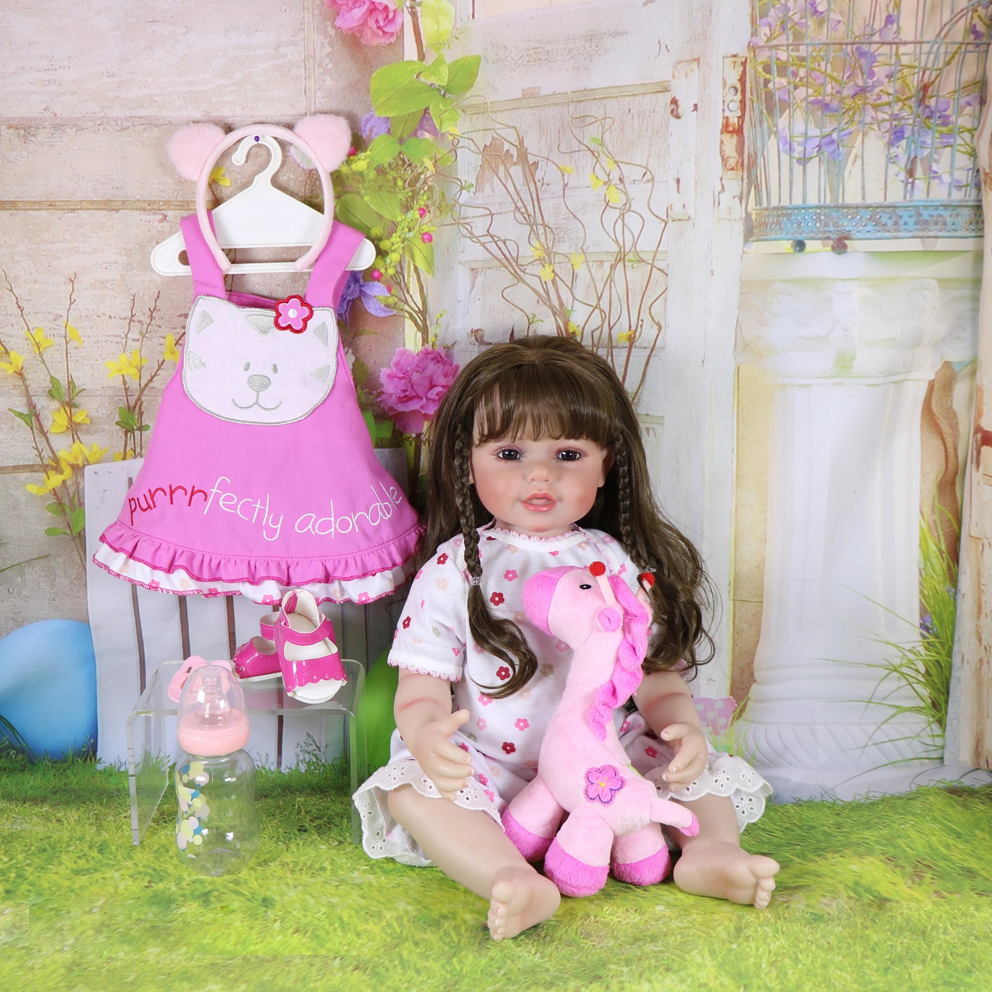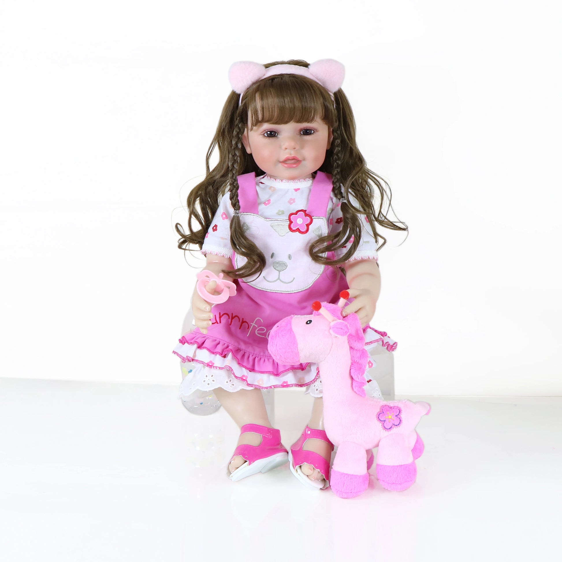 Ensemble includes – 1 One-piece outfit, 1 pink Ear headband, 1*shoes, 1.Birth Certificate 1 pacifier, 1*Stuffed Animals and 1 bottle